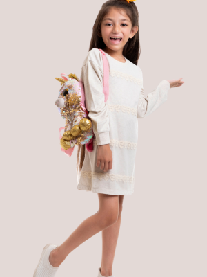 White Dress with Pastel Pink Sash and Velvet Sequin Detailing