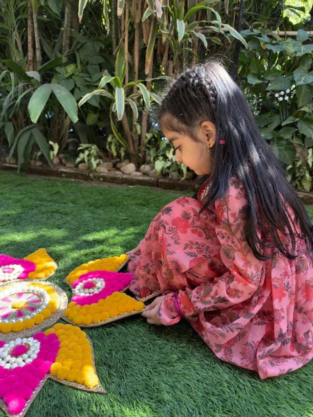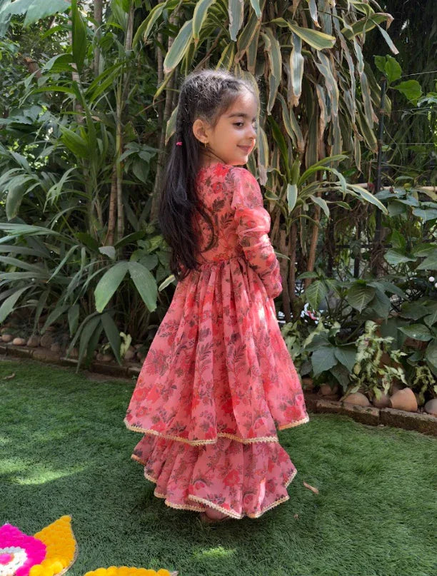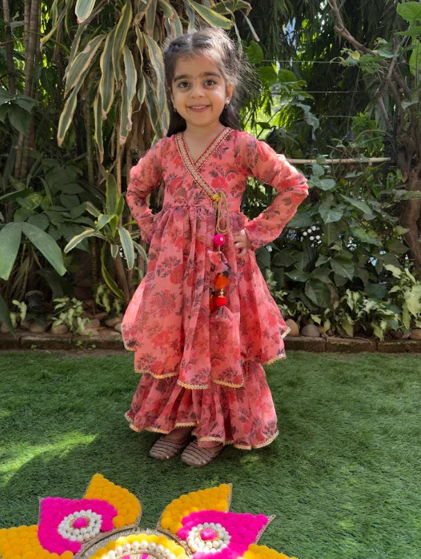 Bring a vibrant burst of floral charm to your little one’s festive look with this beautifully flared sharara set. Designed with churidar-style long sleeves and a peplum silhouette, the top is comfy yet stylish. The flowy sharara pants add drama and fun to twirls, while the gold lace and latkans give it the perfect festive finish. Ideal for Diwali, weddings, or birthdays.