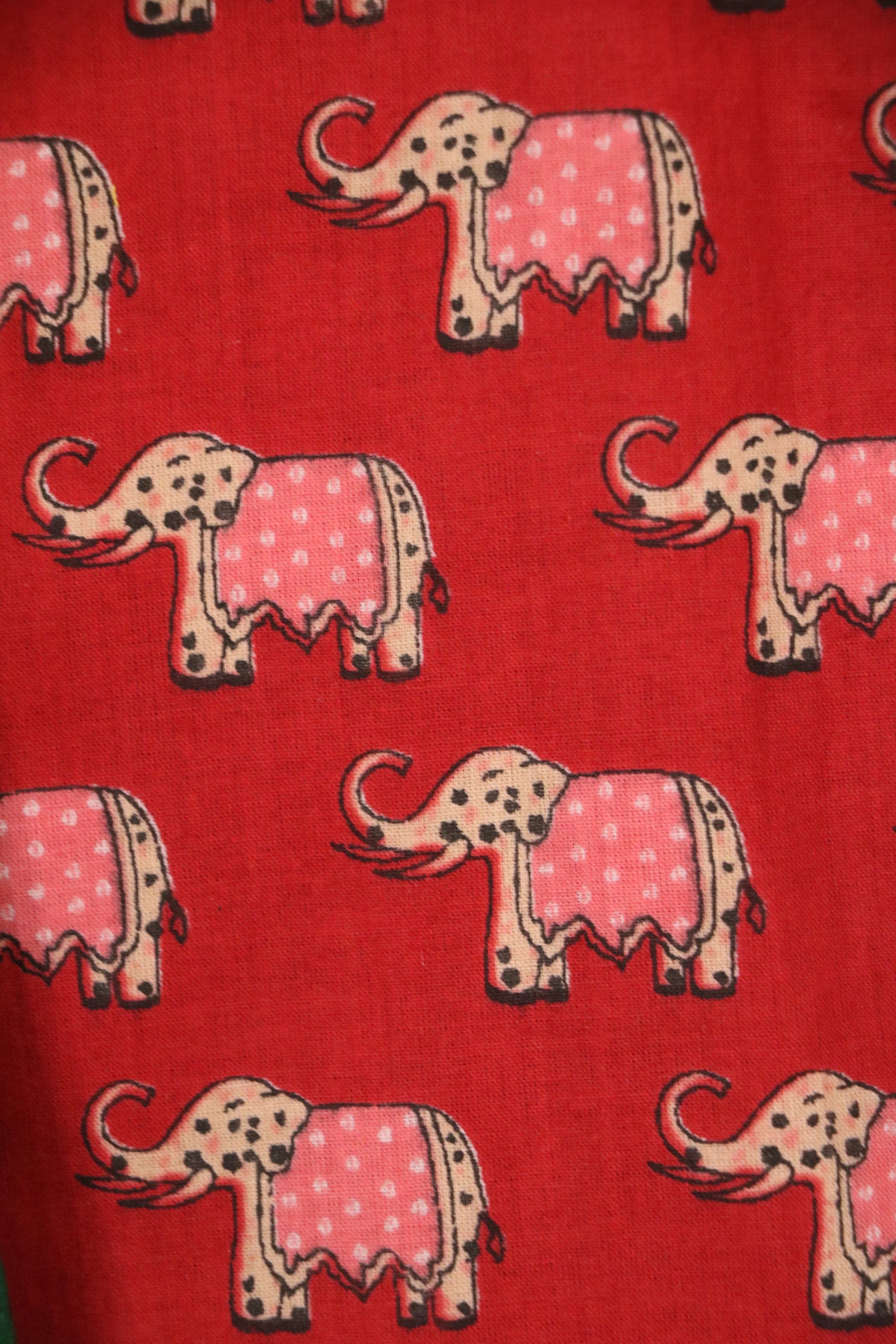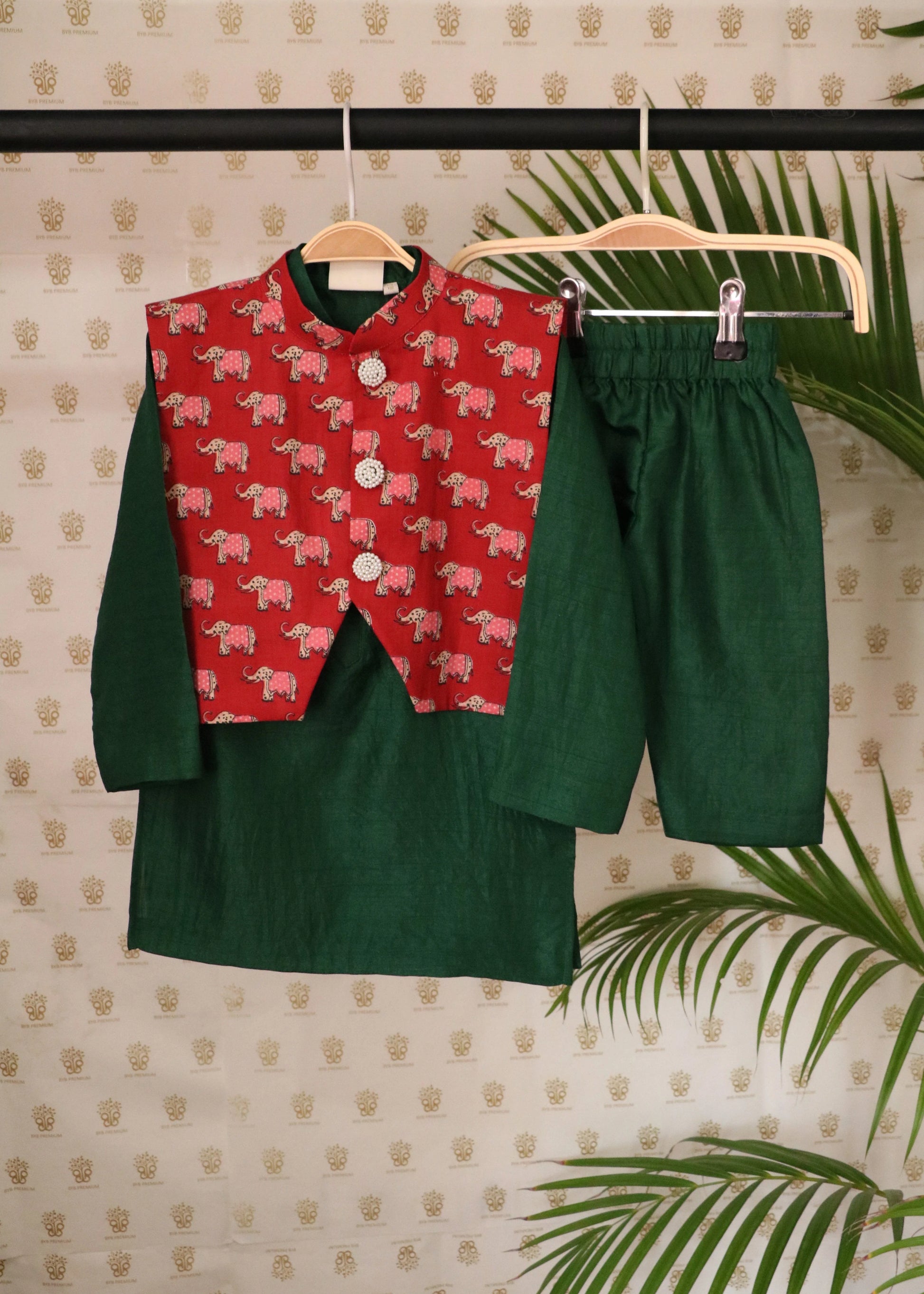 This dark green cotton kurta pyjama set for boys comes with a charming red Jaipuri elephant print jacket that adds just the right pop of festive flair. Designed for comfort and movement, this breathable ensemble is perfect for weddings, pujas, or a playful family function.