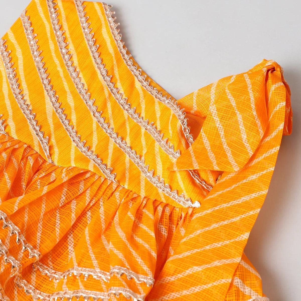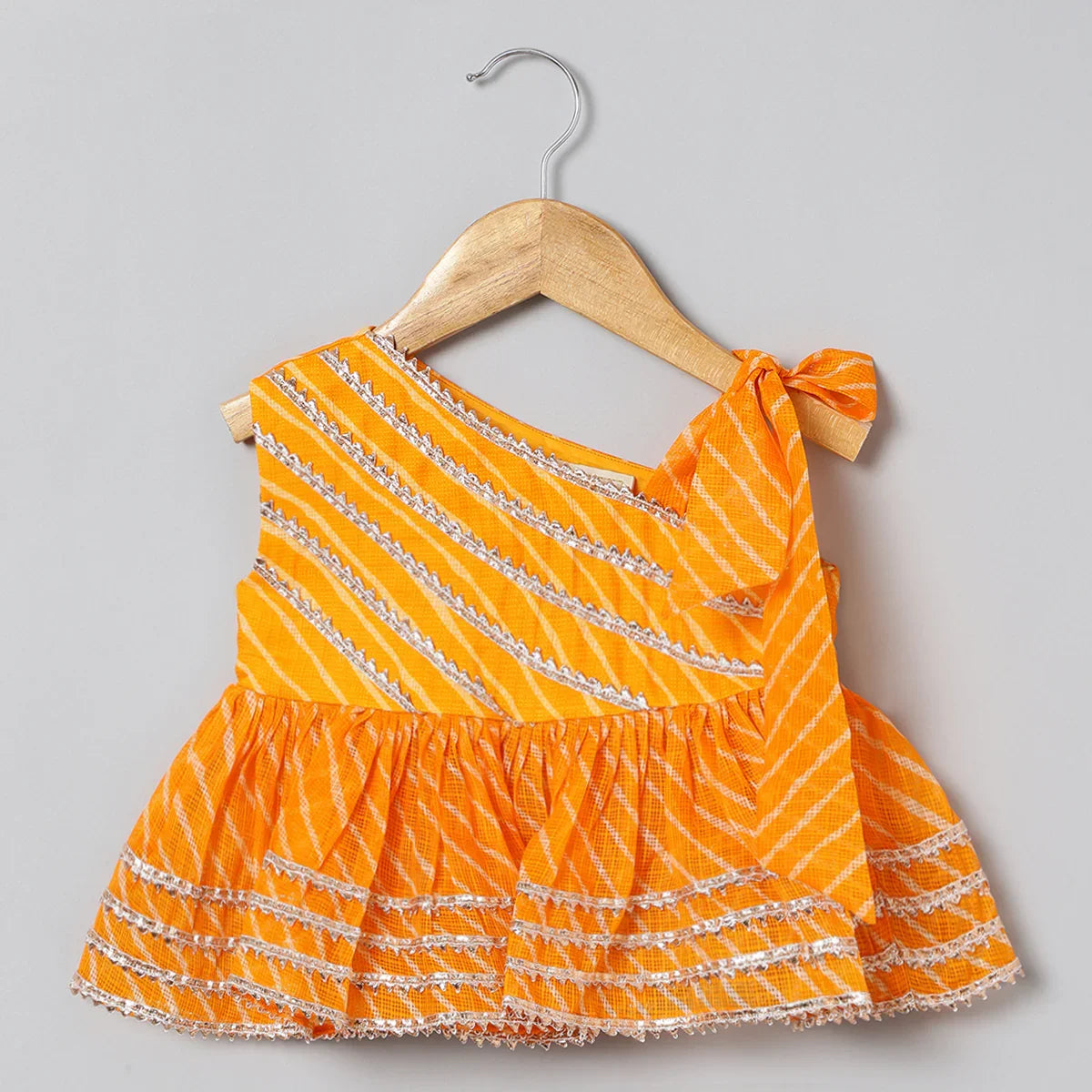 Charming, festive, and full of ethnic flair – this girls Bandhani top and dhoti set is perfect for little divas who love to twirl in tradition. The breezy Kota Doriya fabric keeps it light and comfy, while the vibrant yellow hue and gotta work add a festive sparkle. Paired with a soft off-white dhoti and a twirl-worthy peplum top, this set is a celebration essential for weddings, pujas, or any special occasion.