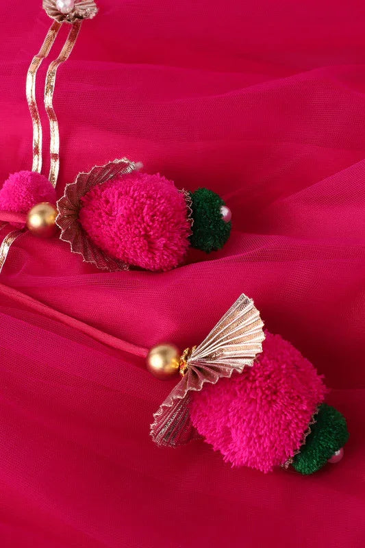 This stylish girls lehenga set features a one-shoulder Chanderi silk blouse with elegant mirror detailing, paired with a matching fuchsia pink skirt designed with delicate gold accents and tassels. The lightweight and breathable fabric ensure comfort, making it perfect for festive occasions, weddings, and celebrations.