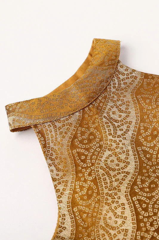 This stunning girls lehenga set is designed for festive occasions, weddings, and special celebrations. The halter-neck blouse crafted from rich poly silk jacquard exudes sophistication. The layered tulle skirt with a shimmering gold border adds a touch of grandeur. The matching net dupatta completes the look, making it an ideal choice for your little one’s ethnic wardrobe.
