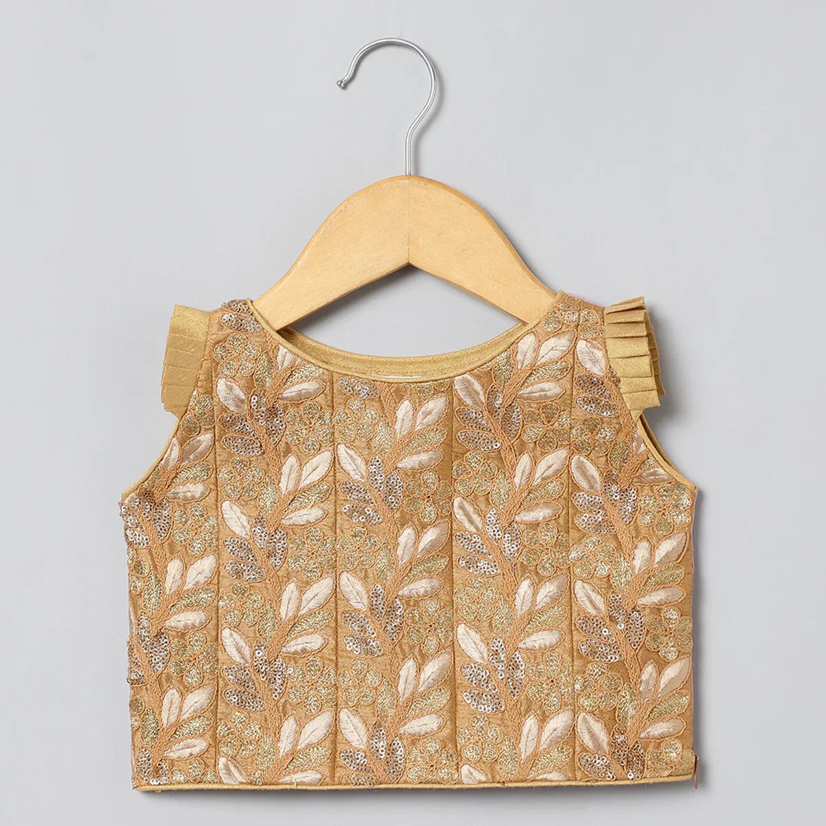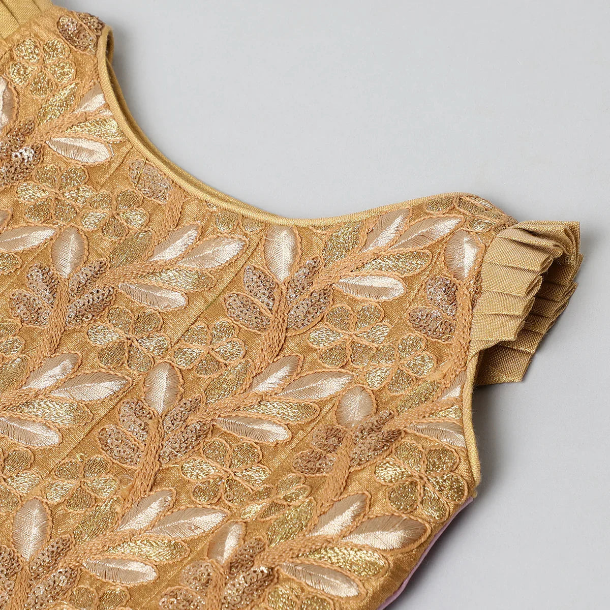This one’s a little showstopper. The rich wine velvet blouse is adorned with hand-embroidered lotus motifs and finished with a sweet ruffled neckline and back tie-up. Paired with a glossy pink satin skirt, this set is made for twirling through wedding functions, birthday bashes, and all things festive.