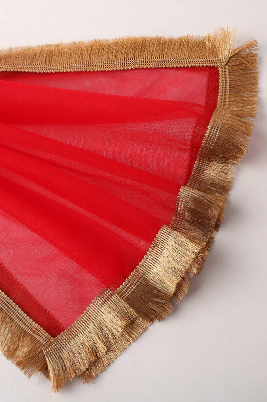 A graceful girls lehenga set featuring a dazzling gold sequin blouse and a net lehenga with gold polka dots. The outfit is completed with a vibrant red net dupatta adorned with a gota border, adding a festive touch. Perfect for weddings, festivals, and special occasions, this girls ethnic wear ensures your little one shines like a star.