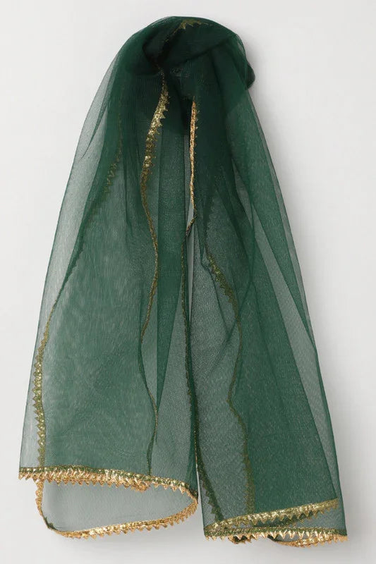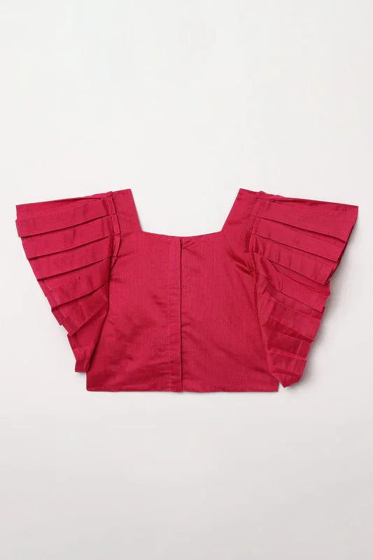 A vibrant three-piece lehenga set for girls, featuring a fuchsia blouse with statement pleated sleeves and mirror detailing, paired with a yellow lehenga with intricate lace borders and a green net dupatta for a festive touch. Perfect for weddings, celebrations, and traditional events!