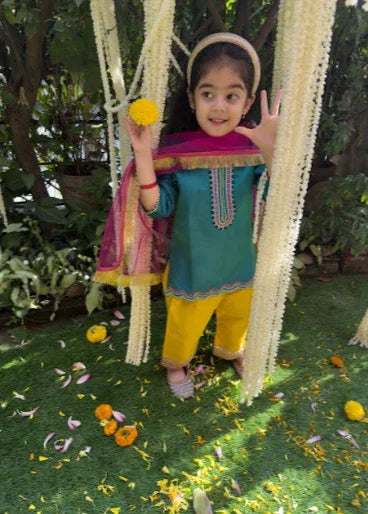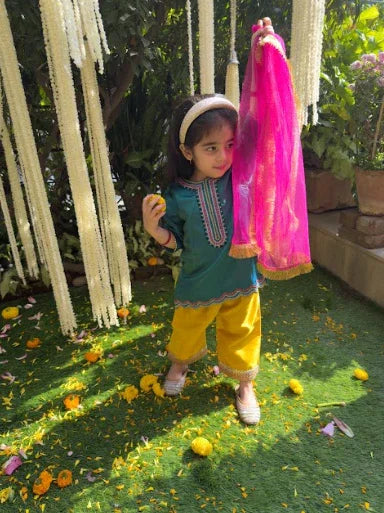 A vibrant green satin girls silk kurti with detailed satin thread embroidery and gota lace on the sleeves. Paired with yellow pants featuring an elasticated waist and gota lace hem, and a contrasting pink dupatta with fringe details. Perfect for festive and special occasions.