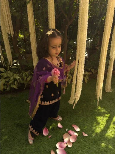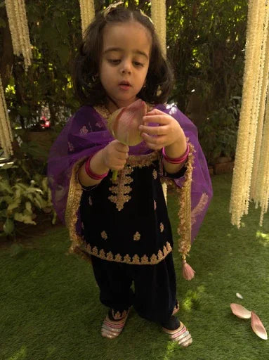 girls velvet kurti with intricate hand embroidery using beads and zari. Paired with a velvet Patiala featuring an elasticated waist and detailed embroidery on the hem. The dupatta is adorned with gota lace, pearls, and fringe tassels on the edges, adding a playful touch.