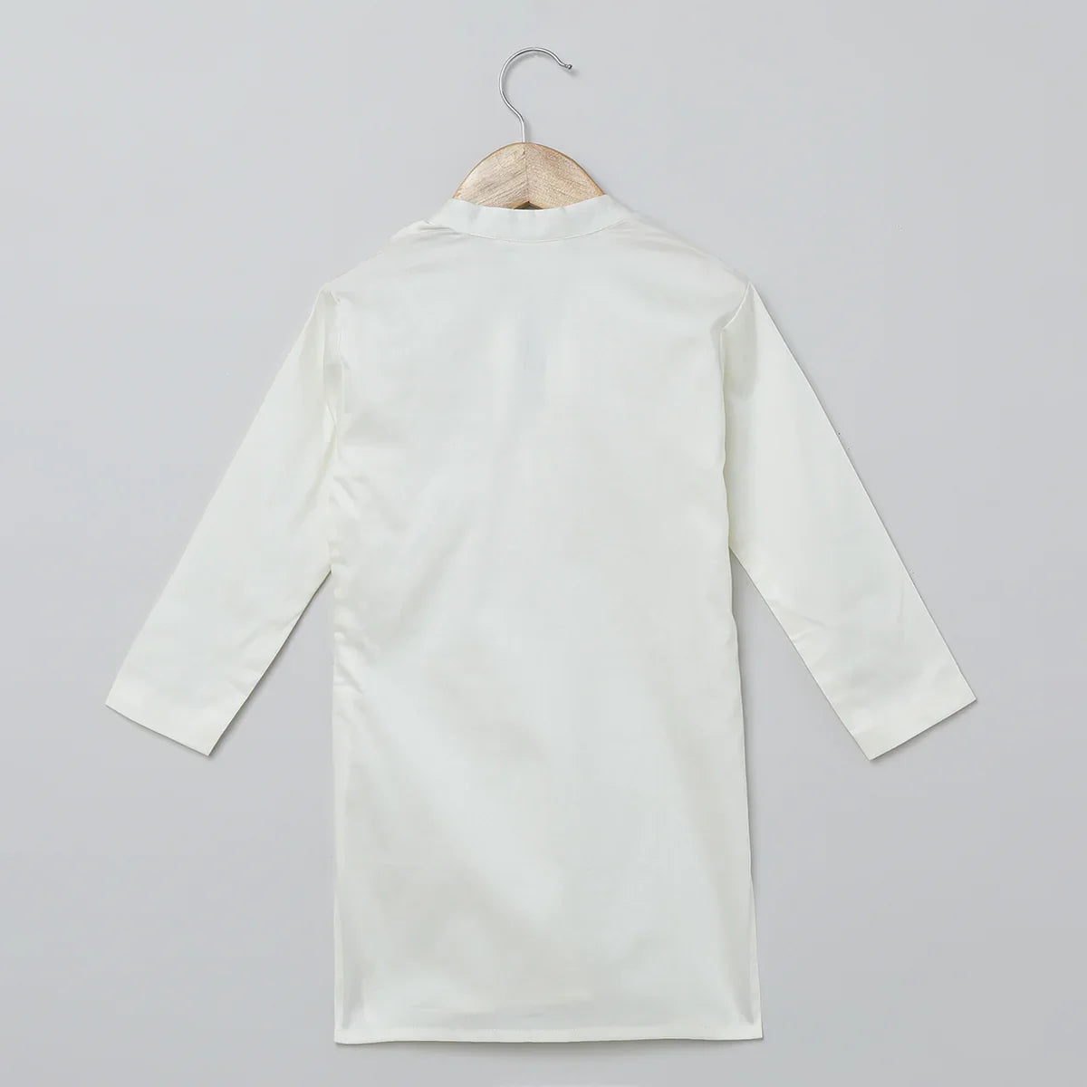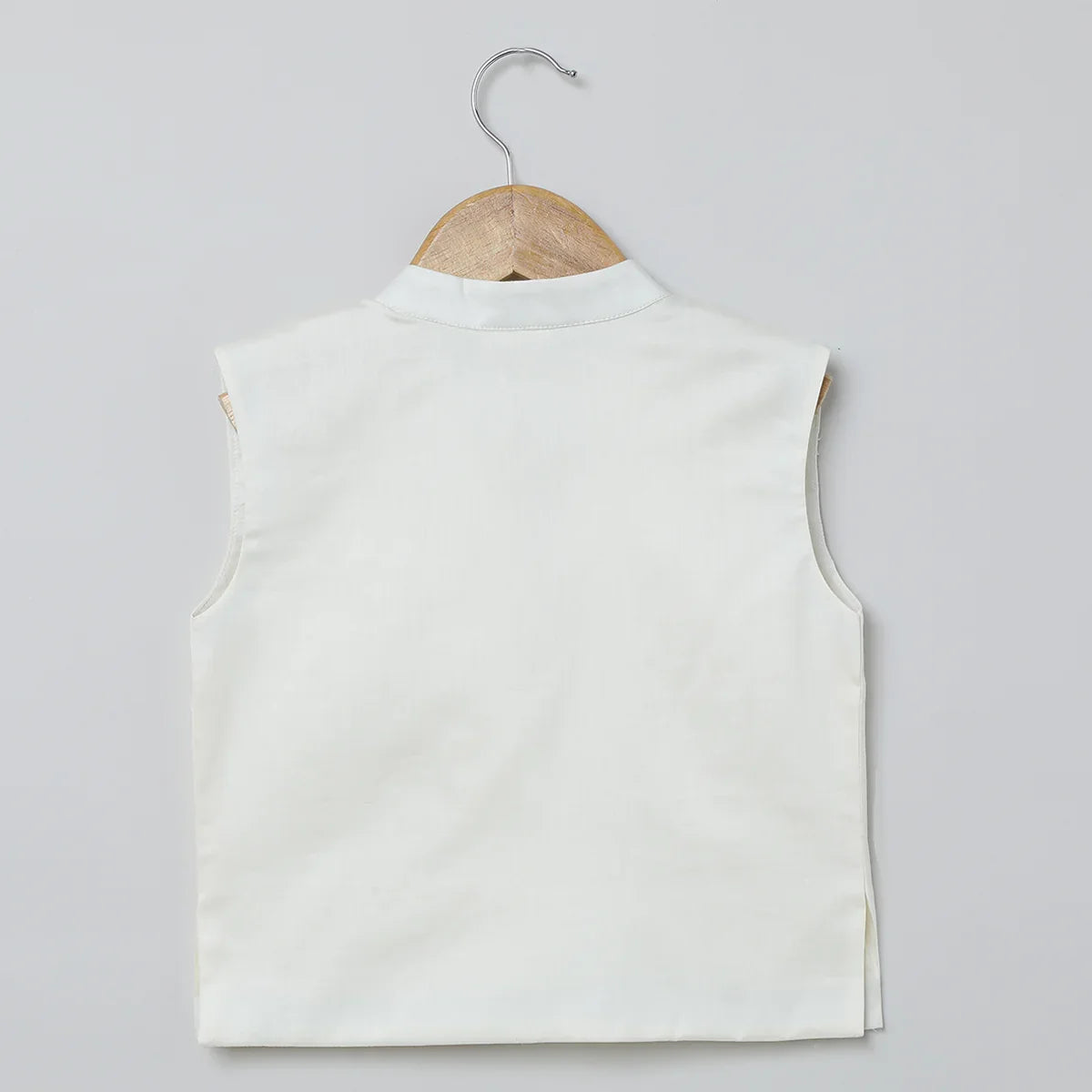 This charming white and red ethnic set for boys is crafted from soft, breathable cotton, making it perfect for festivals, weddings, or family gatherings. The full-sleeve kurta features beautiful heart-shaped beadwork around the neckline, paired with a classic pyjama for comfort. A stylish jacket completes the look, adding an extra touch of tradition and style for special occasions.
