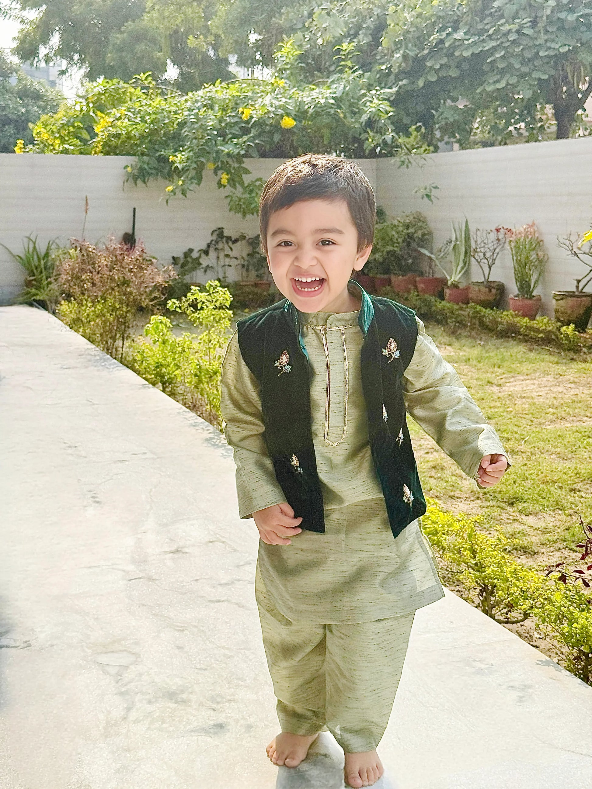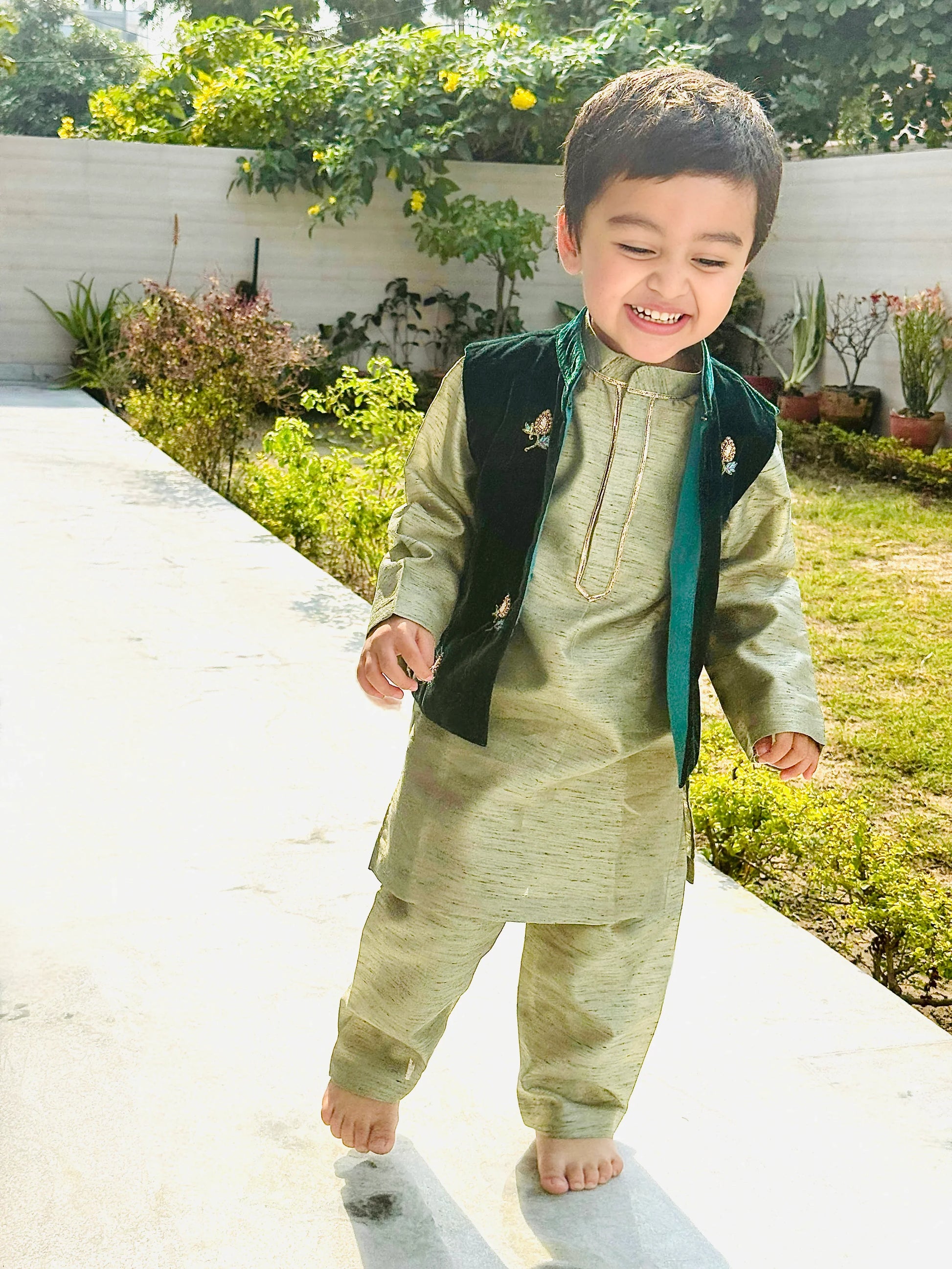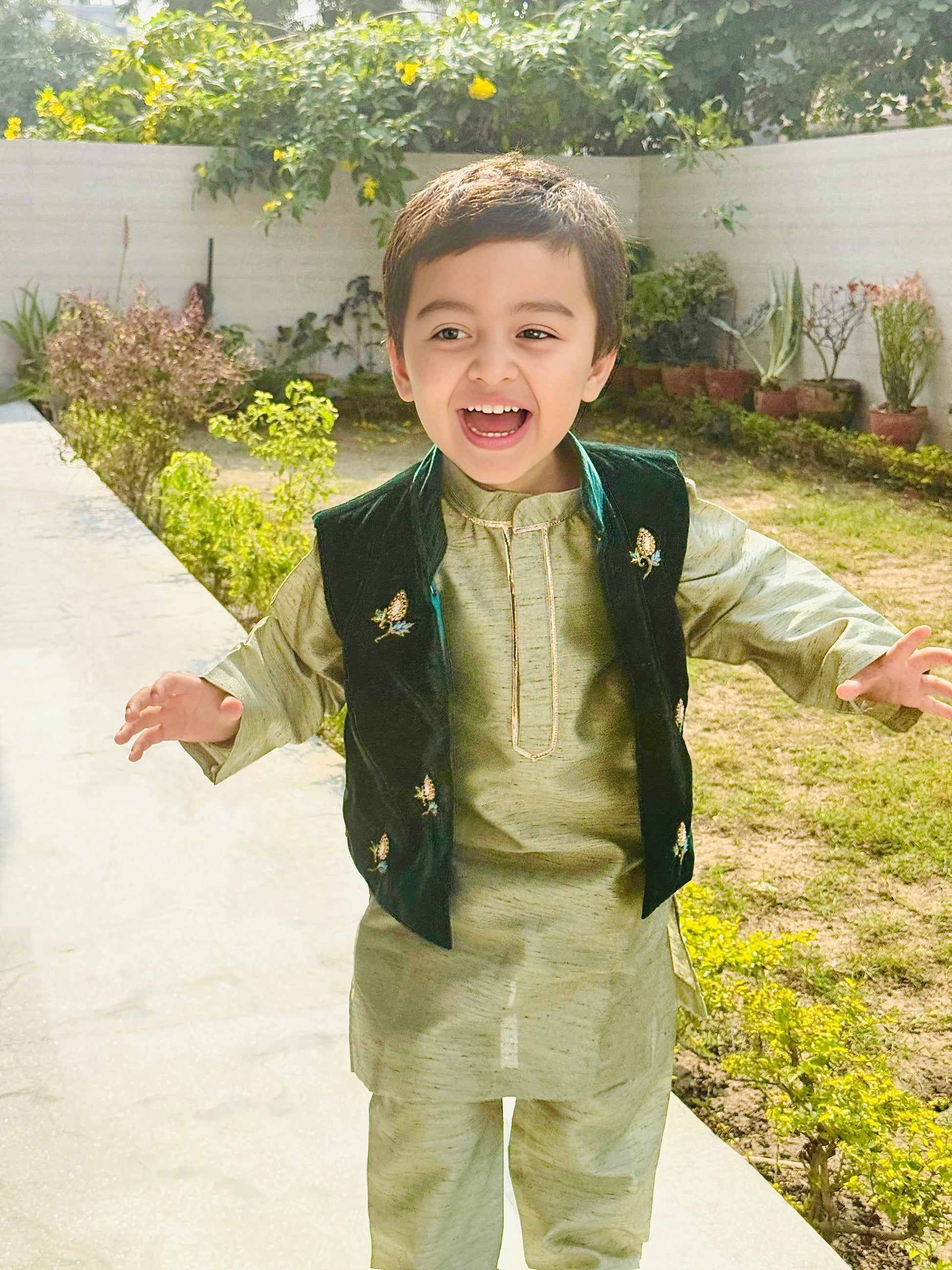 Sage Raw Silk Kurta, Velvet Bandi, and Pyjama